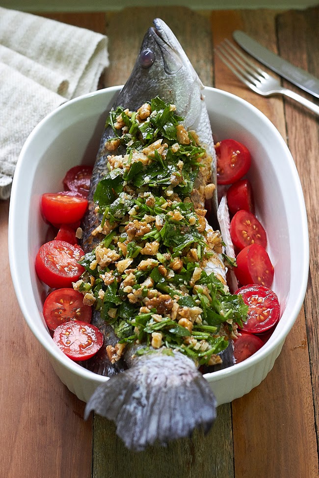 Try it one day. It’s pretty simple, healthy, and delicious. The walnut dressing works well with the mild taste of fish flesh. This dish is of Middle Eastern origin where it is called ‘samak harra’.